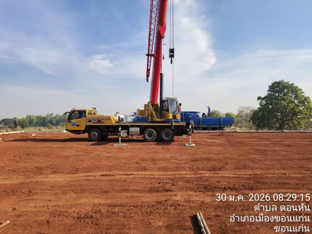 ใช้รถเครนขนาดเหมาะสมในการยกและติดตั้งเสาเหล็กและโครงหลังคา ทีมงานควบคุมตำแหน่ง ระดับ และแนวอาคารอย่างละเอียด ทำให้โครงสร้างขึ้นรูปได้รวดเร็วและตรงตามแบบ