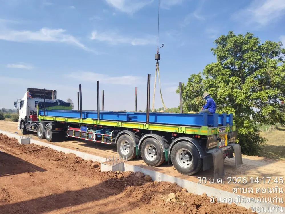 โครงสร้างเหล็กสำเร็จรูปถูกขนส่งจากโรงงานมายังหน้างานอย่างเป็นระบบ มีการจัดเรียงตามลำดับการติดตั้ง ช่วยลดเวลาการทำงานและเพิ่มความปลอดภัยในพื้นที่ก่อสร้าง